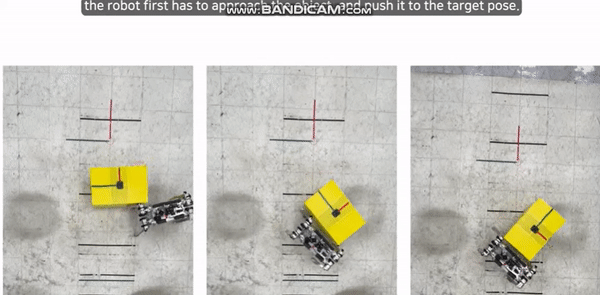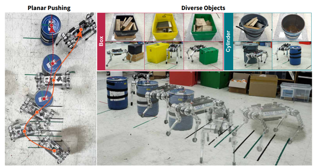 而在实际检验中,分层策略可以让一只27公斤重的机器狗用身体来移动平面上的物体,而它事先并不知道任何关于物体特征的信息。实验中,团队使用了5种不同特征的物体,包括质心会一直变化的物体——一个装了19.2公斤水的桶。