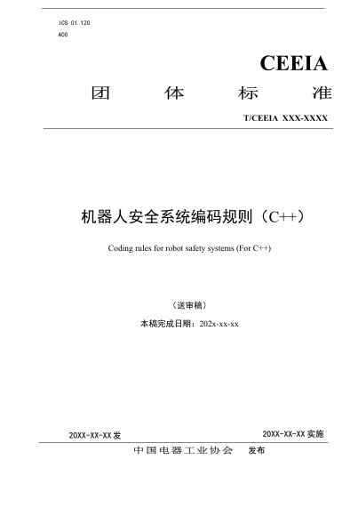范围:该文件适用范围包括但不仅限于: 对机器人安全系统相关程序的 C++编码进行了规范,适用于机器人安全系统相关的所有软件 C++代码;适用于 GB/T 12643 中定义的所有机器人;可供机器人研制厂商及检测机构使用。