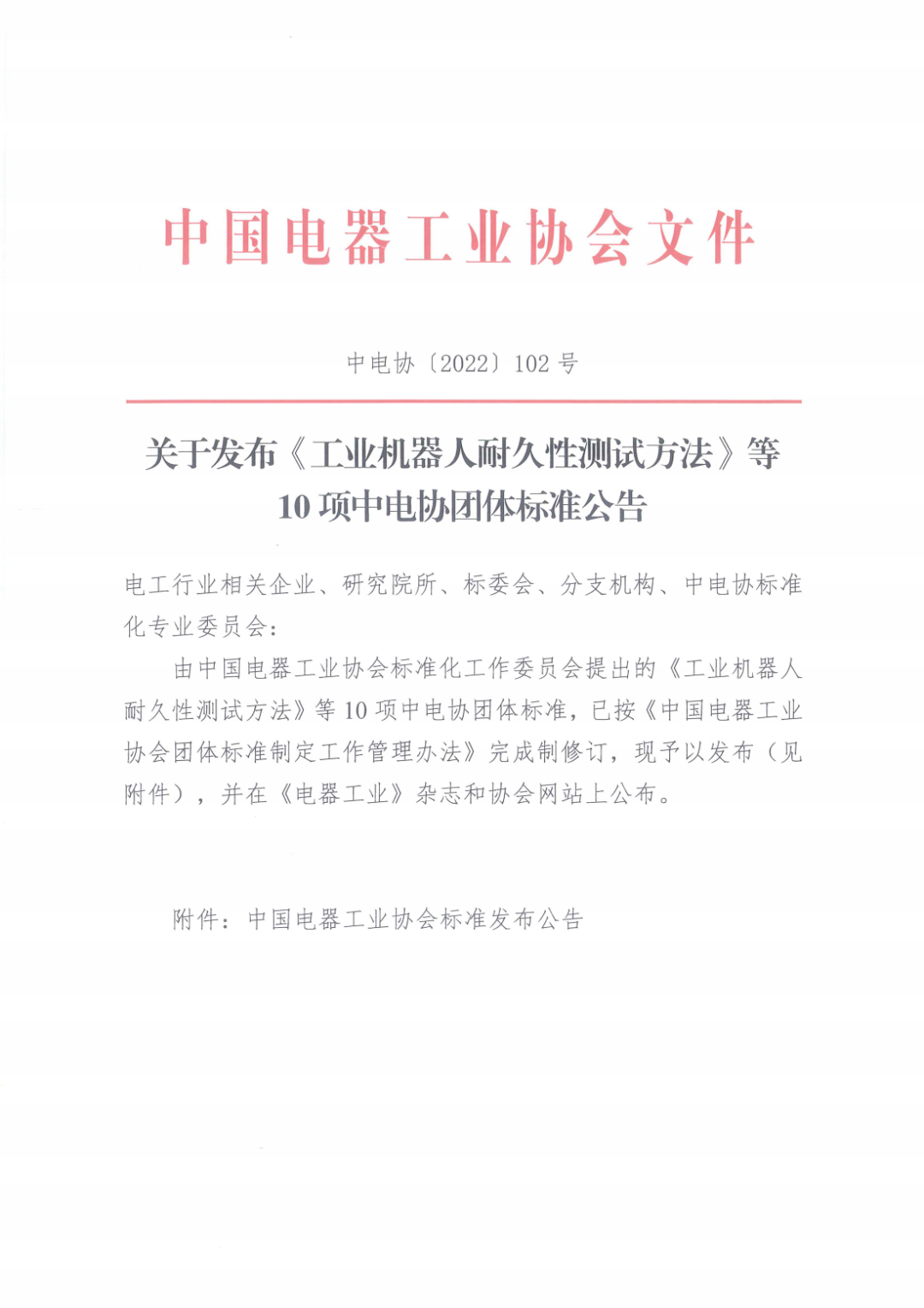 2022年7月,由中电协电气场所用机器人安全与检测标准化专业委员会归口《工业机器人耐久性测试方法》等10项团体标准正式发布,涉及领域均为机器人。